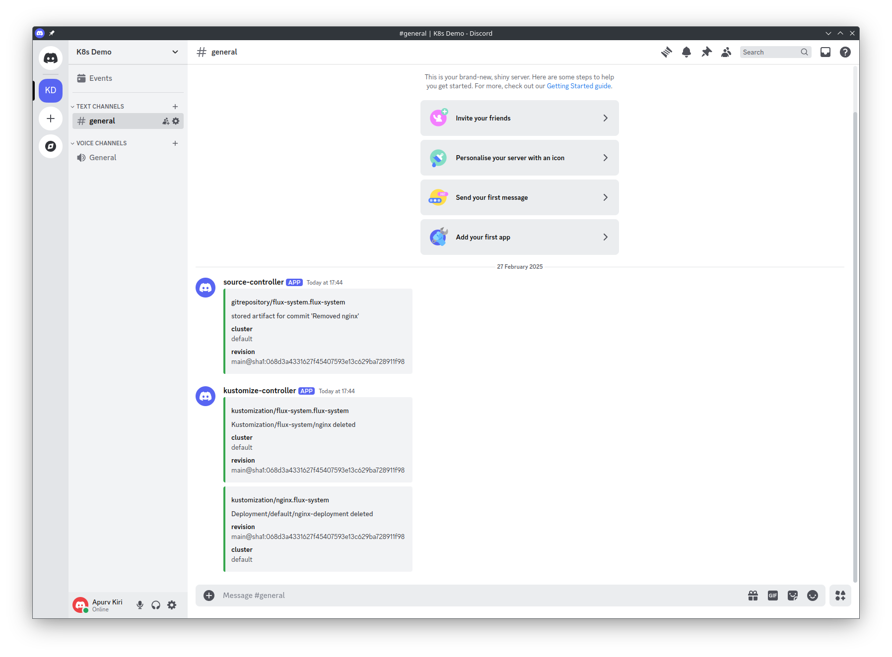 To validate that our alerts are functioning as expected, let’s trigger an event by removing a previously created resource. In this case, we’ll delete the nginx deployment we created during our initial FluxCD setup.