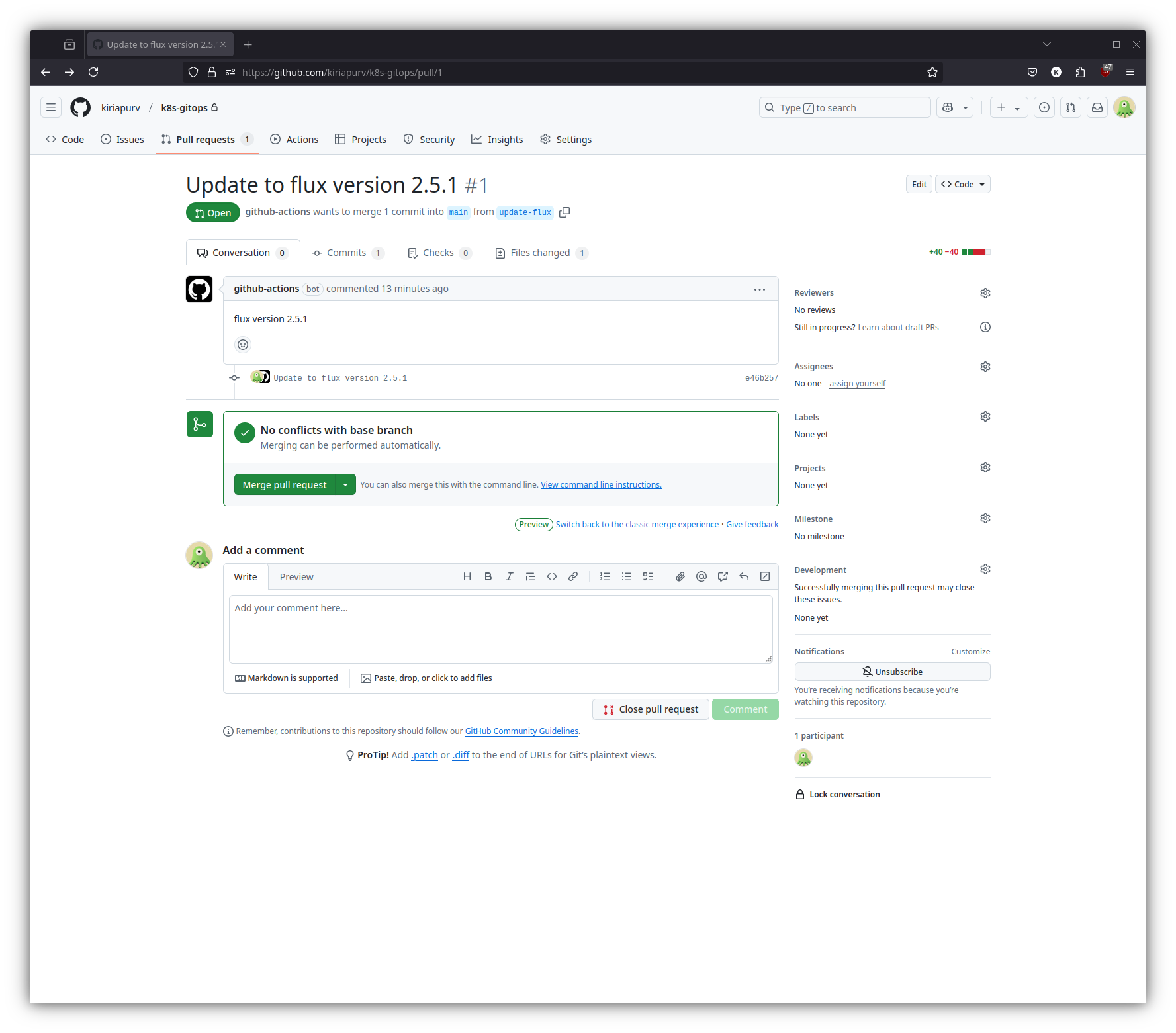 As demonstrated in the screenshot, the workflow has successfully detected and proposed an update to FluxCD version 2.5.1, creating a pull request that can be reviewed and merged through our standard governance process.